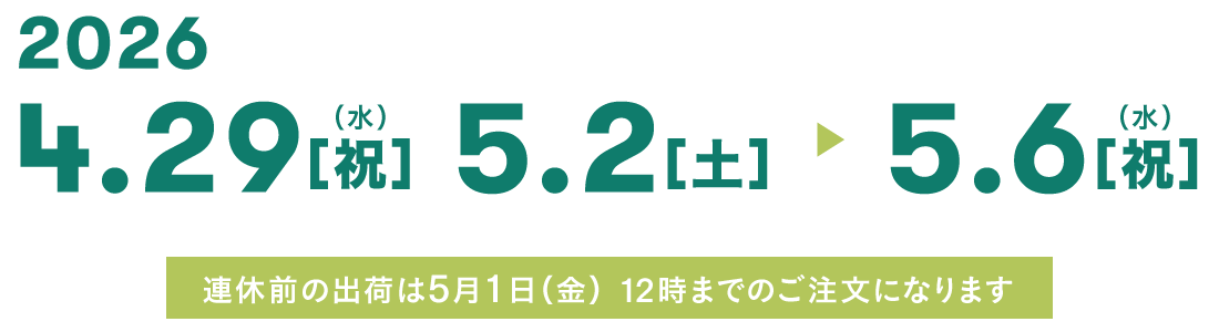 連休前の最終出荷は、5/1(金)12時までとさせていただきます。