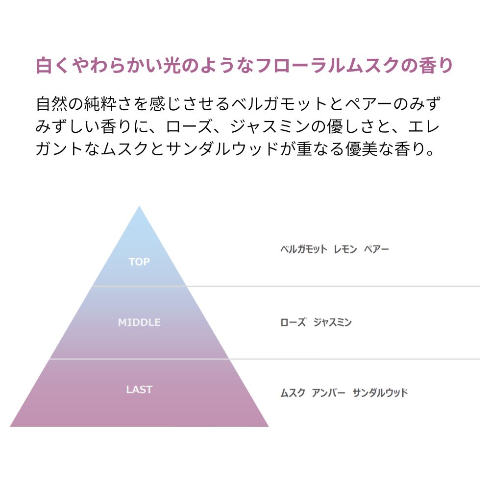 | 香り | 白くやわらかい光のようなフローラルムスクの香り 自然の純粋さを感じさせるベルガモットとペアーのみずみずしい香りに、ローズ、ジャスミンの優しさと、エレガントなムスクとサンダルウッドが重なる優美な香り。 TOP・・・ベルガモット、レモン、ペアー MIDDLE・・・ローズ、ジャスミン LAST・・・ムスク、アンバー、サンダルウッド |