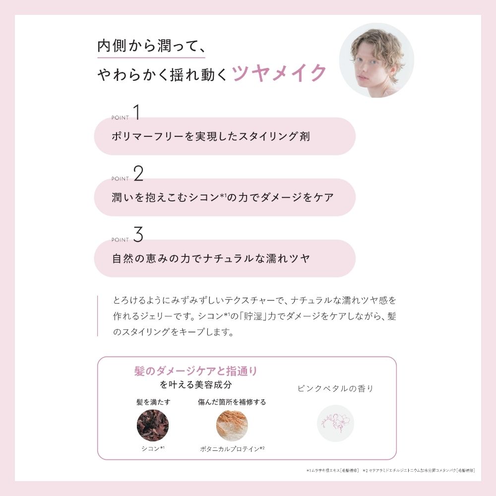 | ご使用方法 | 適量を手に取り、手のひらでよく伸ばし、乾いた髪、もしくはパーマスタイルの場合は軽く濡らしハーフドライした髪になじませスタイリングします。 |