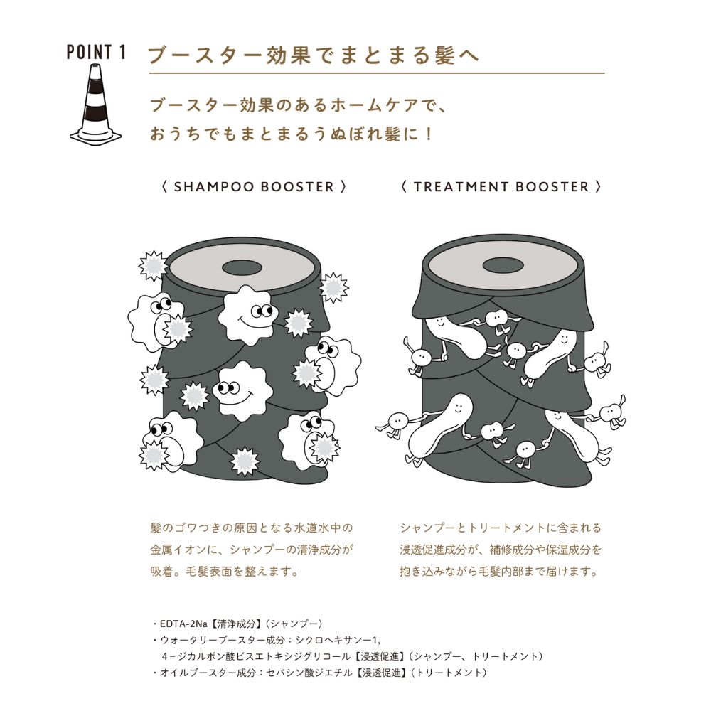 TREATMENT BOOSTER:シャンプーとトリートメントに含まれる浸透促進成分が、補修成分や保湿成分を抱き込みながら毛髪内部まで届けます。
