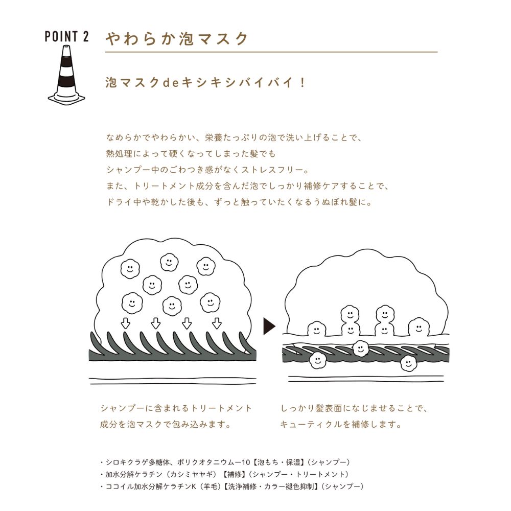 なめらかでやわらかい、栄養たっぷりの泡で洗い上げることで、熱処理によって硬くなってしまった髪でもシャンプー中のごわつき感がなくストレスフリー。