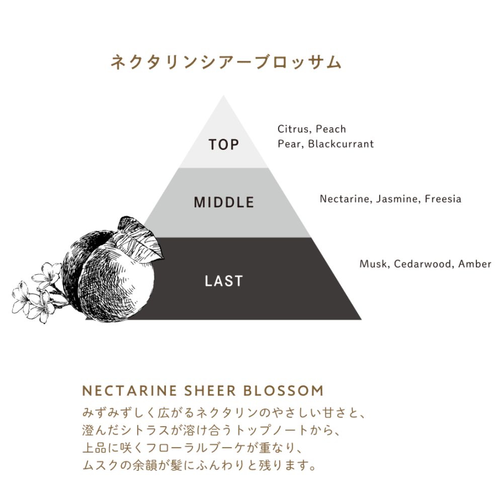| 香り | NECTARINE SHEER BLOSSOM(ネクタリンシアーブロッサム) みずみずしく広がるネクタリンのやさしい甘さと、澄んだシトラスが溶け合うトップノートから、上品に咲くフローラルブーケが重なり、ムスクの余韻が髪にふんわりと残ります。 TOP・・・シトラス、ピーチ、ペア、ブラックカレント MIDDLE・・ネクタリン、ジャスミン、フリージア LAST・・・ムスク、シダーウッド、アンバー |