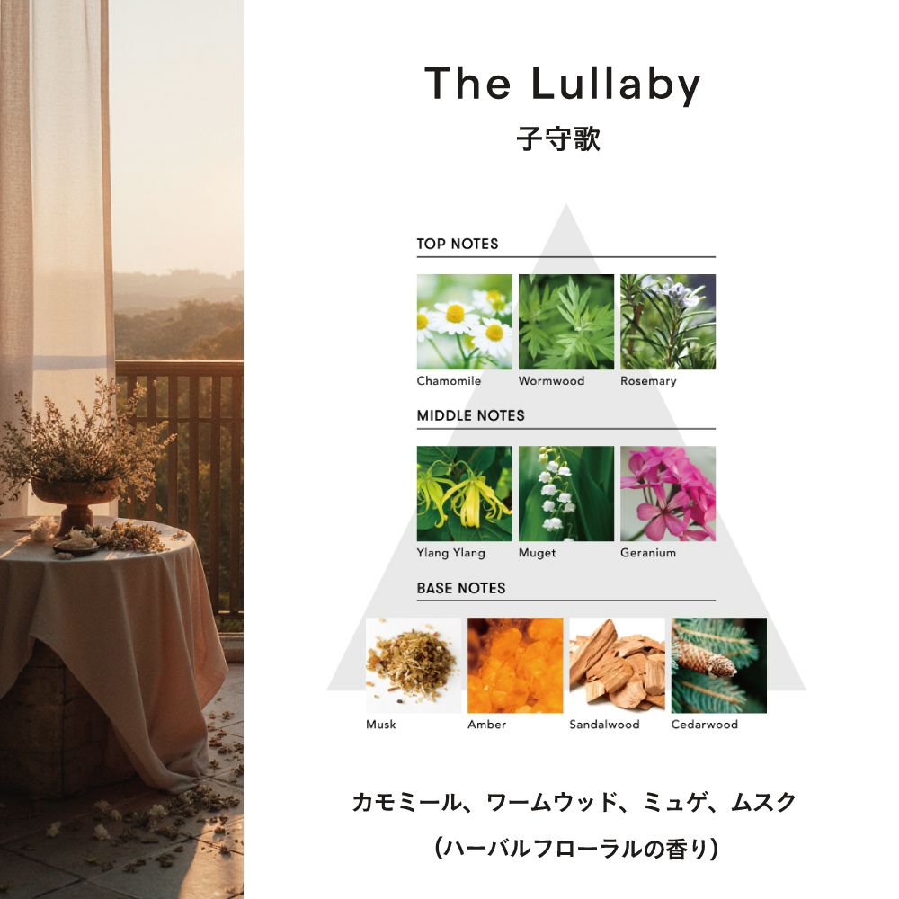 | 香り | ■The Lullaby 子守歌 華やか差の中に静けさを湛えたイランイランに、安らぎをもたらすハーバルノートが重なり合う、穏やかで心をほどくハーバルフローラル調の香り。 カモミールの柔らかな甘さとワームウッドのほのかな苦みが呼吸をそっと整え、気持ちを静かにほどいていく。 ゼラニウムやクラリセージの静かな力が、ミュゲやフローラルの余韻と溶け合い、内側からやさしく満たされるような幸福感をもたらす。 それは思考の波が静まり、まぶたの裏に穏やかな闇が広がっていくような感覚。 目を閉じて、何も手放さず、何も求めずに、ただ深く休むこと。 " The Lullaby " は、そんなやさしく穏やかな無音のひとときをくれる。 TOP・・・Chamomile,Wormwood,Rosemary MIDDLE・・・Ylang Ylang,Muguet,Geranium BASE・・・Musk,Amber,Sandalwood,Cedarwood |