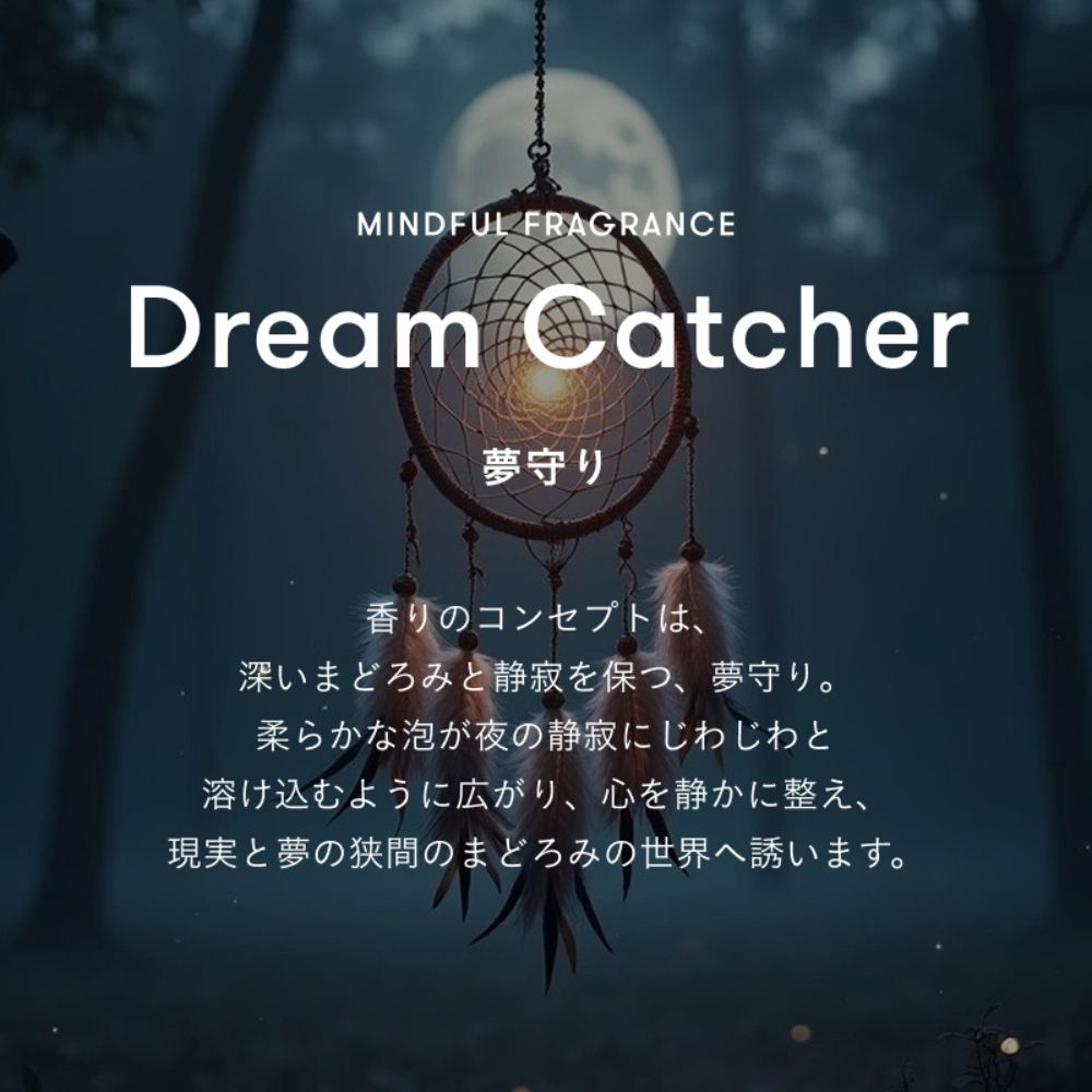 | 香り | Dream Cather(夢守り) 香りのコンセプトは、深いまどろみと静寂を保つ、夢守り。 柔らかな泡が夜の静寂にじわじわと溶け込むように広がり、心を静かに整え、現実と夢の狭間のまどろみの世界へ誘います。 TOP NOTES・・・ベルガモット、マンダリン、ペアー、ピンクペッパー MIDDLE NOTES・・・ローズ、ジャスミン BASE NOTES・・・ホワイトムスク、バニラ、パチュリ、シダーウッド トップは、瑞々しくフルーティーな香りにピンクペッパーがアクセントとして香り、やがてまったりとした甘さを放つローズやジャスミンがミドルで広がります。 ホワイトムスクやバニラの濃厚な甘さをスパイシーなシダーウッドの余韻が、眠りの森の入口を開きながら、心や脳を柔らかく解きほぐしていく。 まるで、宙を浮いているかのような夢心地の香りは、一日の疲労を癒すように入眠空間を整え、豊かな眠りへ誘います。 |