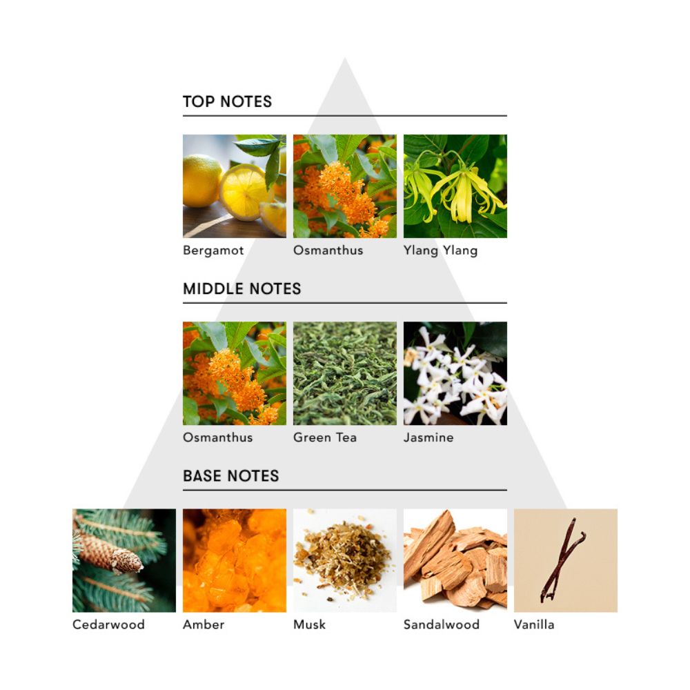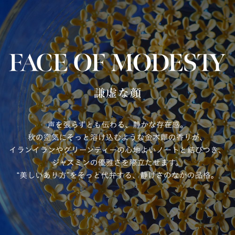 | 香り | 声を張らずとも伝わる、静かな存在感。それはまるで、秋の空気にそっと溶け込む金木犀の香りのよう。 ベルガモットと金木犀がふんわりと立ち上り、グリーンティーとジャスミンが清らかさと静けさを重ねていく。 そこにイランイランの甘さが奥行きを添え、サンダルウッドとバニラがやさしく余韻を包み込む。 どこか儚く、透明感をたたえた香りは、主張しなくても心に残る。 “美しいあり方” をそっと代弁する、静けさのなかの品格。 TOP・・・ベルガモット、オスマンサス、イランイラン MIDDLE・・・オスマンサス、グリーンティー、ジャスミン BASE・・・シダーウッド、アンバー、ムスク、サンダルウッド、バニラ |