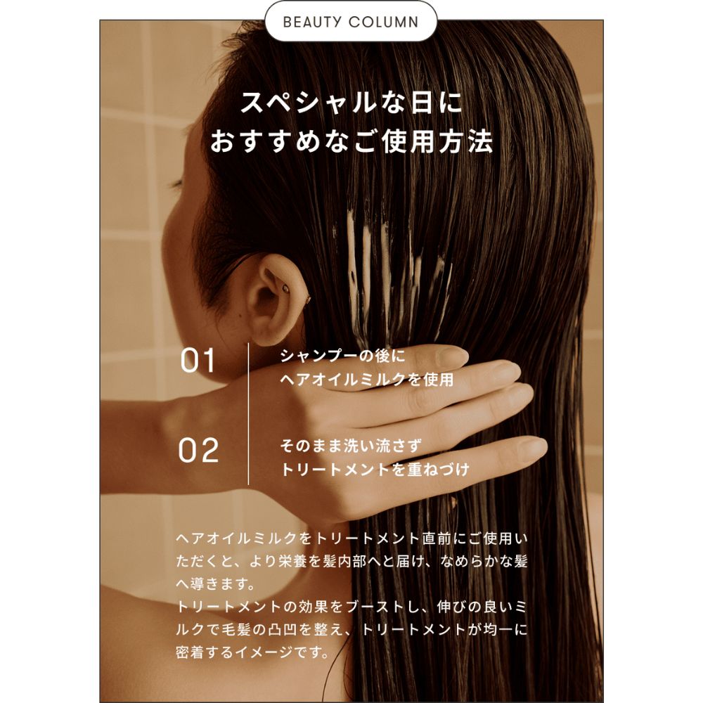 オイルとミルクの絶妙なバランスで指通りなめらかに、髪の質感そのものを格上げします。