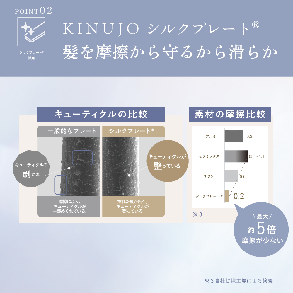 シルクプレートは、一般的なプレート素材の中でも、摩擦による髪への負担*1が少なく、キューティクルを傷めずに、滑らかな使い?地を可能にします。