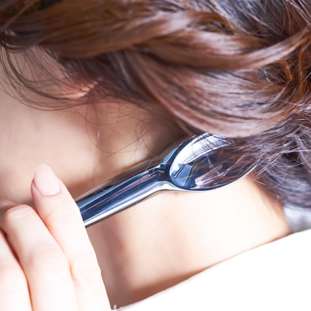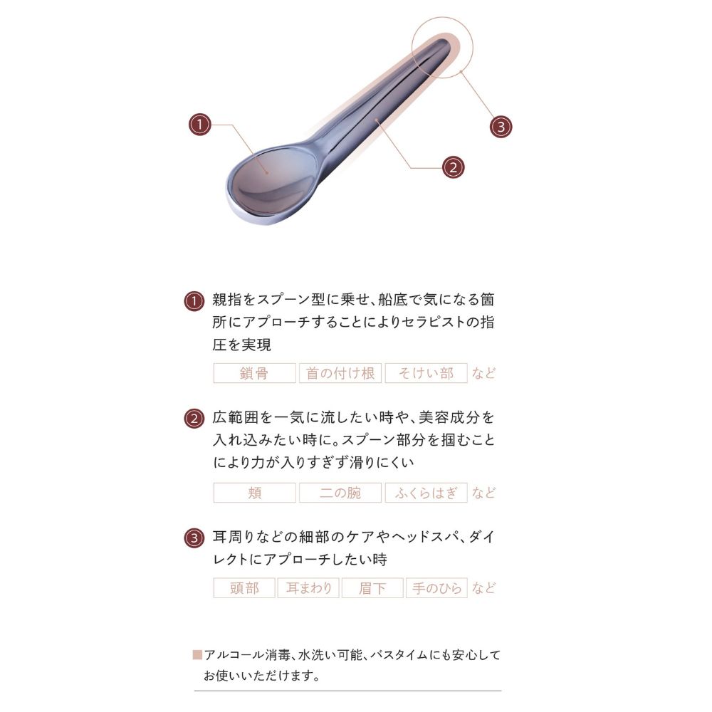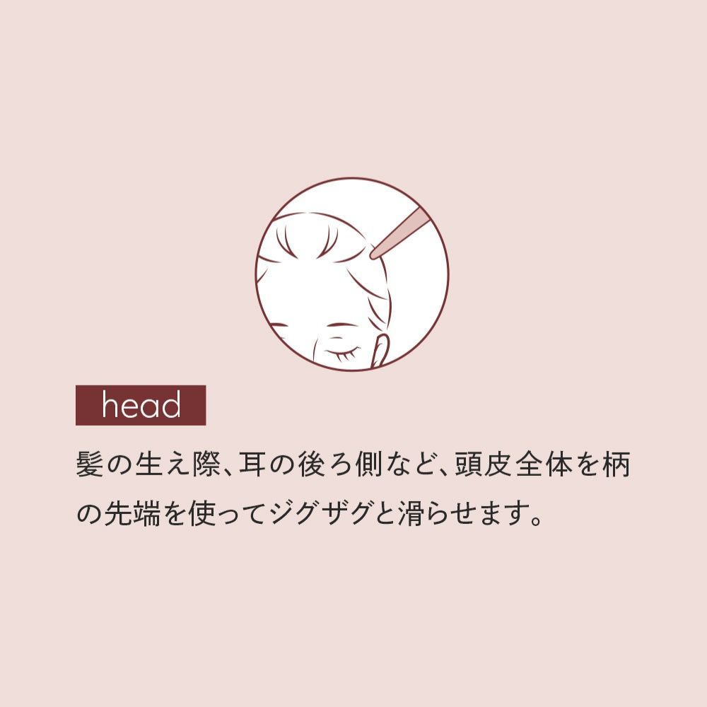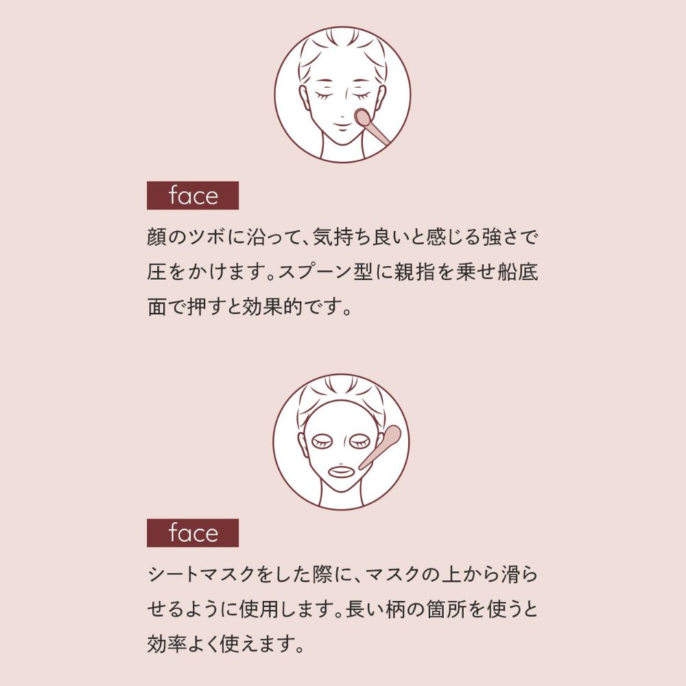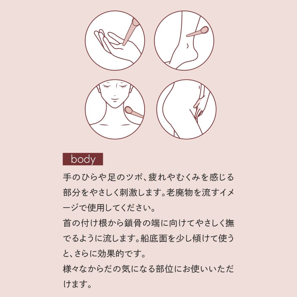 | ご使用方法 | face:顔のツボに沿って、気持ち良いと感じる強さで圧力をかけます。スプーン型に親指を乗せて船底面で圧迫と効果的です。 シートマスクをした際に、マスクの上から滑らせるように使います。長い柄の箇所を使って効率よく使えます。 head:髪の生え際、耳の後ろ側など、頭皮全体を柄の先端を使ってジグザグと滑らせます。 body:手のひらや足のツボ、疲れやむくみを感じる部分を優しく刺激します。老廃物を流すイメージで使ってください。 首の付け根から鎖骨の端に向けて優しく撫でるように流れます。船底面を少し考えて使って、さらに効果的です。様々なからだの気になる部位にお使いいただけます。 |