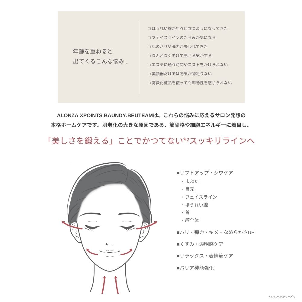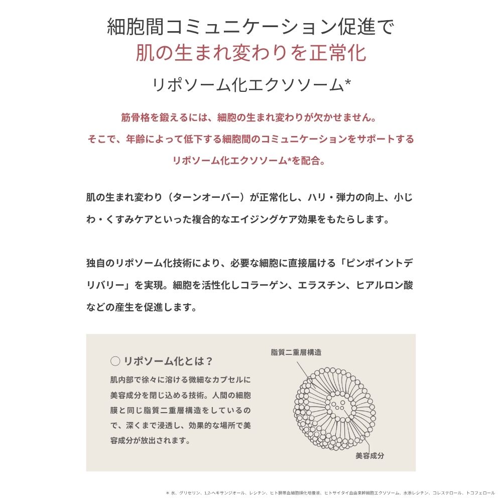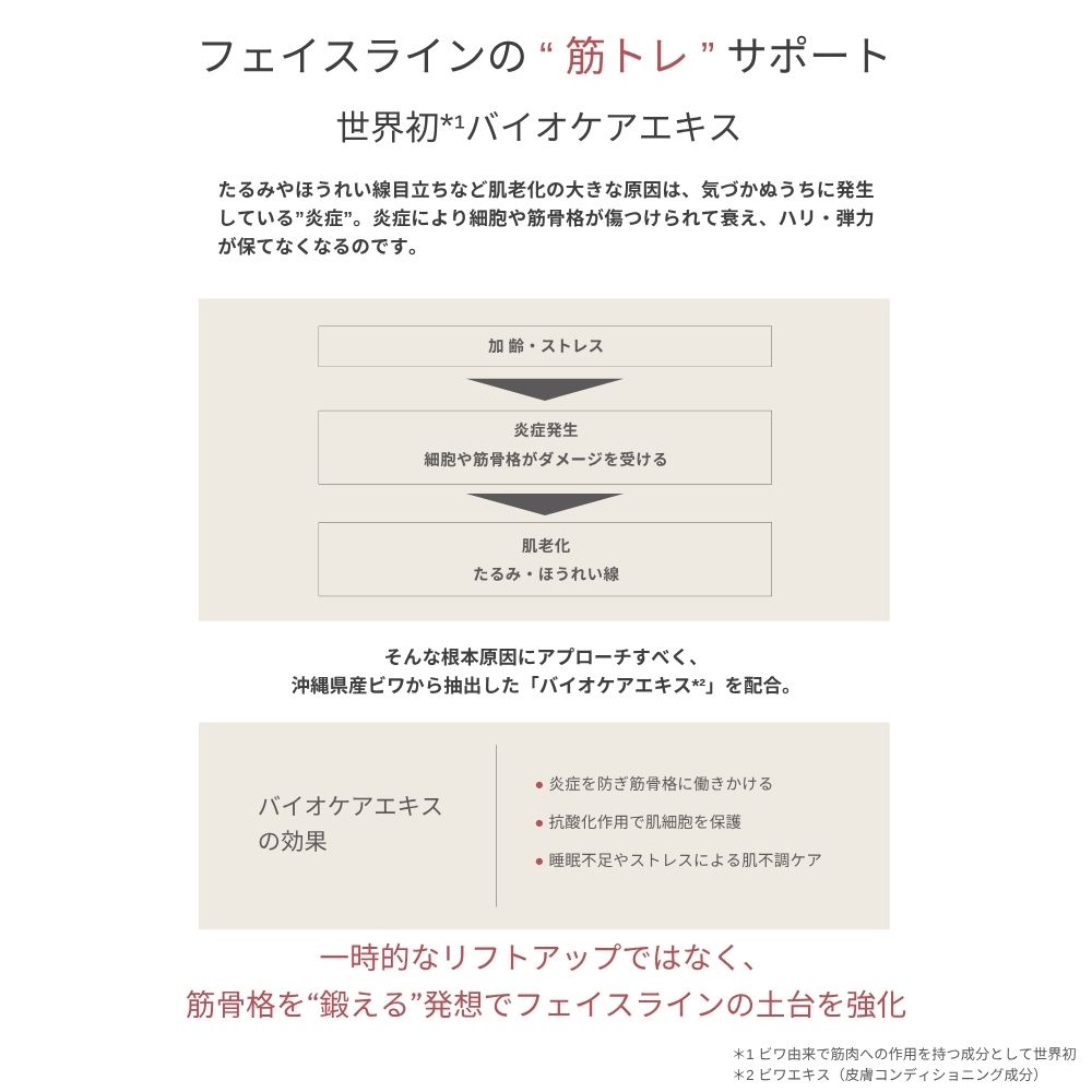 肌老化の根本原因である筋骨格と細胞エネルギーに着目し、贅沢成分の美容クリームと3機能美顔器、独自メゾットの融合で「美しさを鍛える」新発想でかつてない*スッキリラインへ。