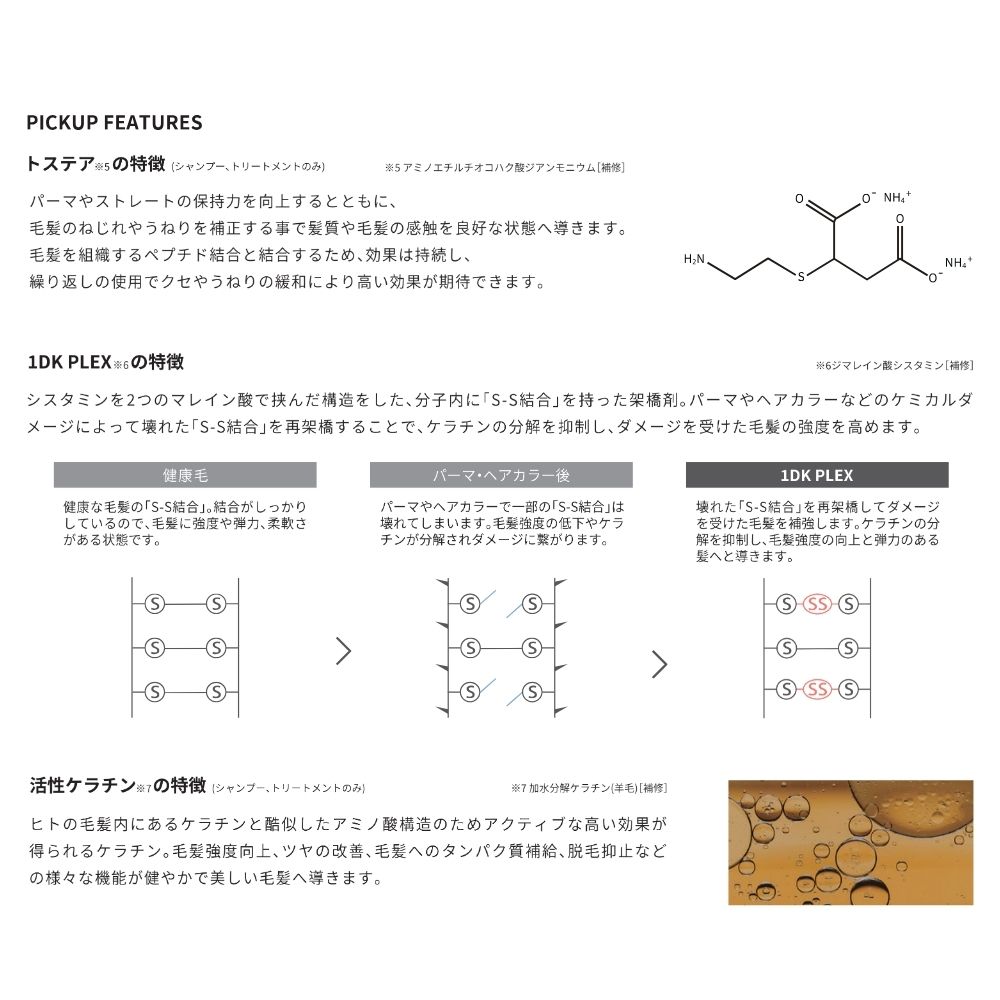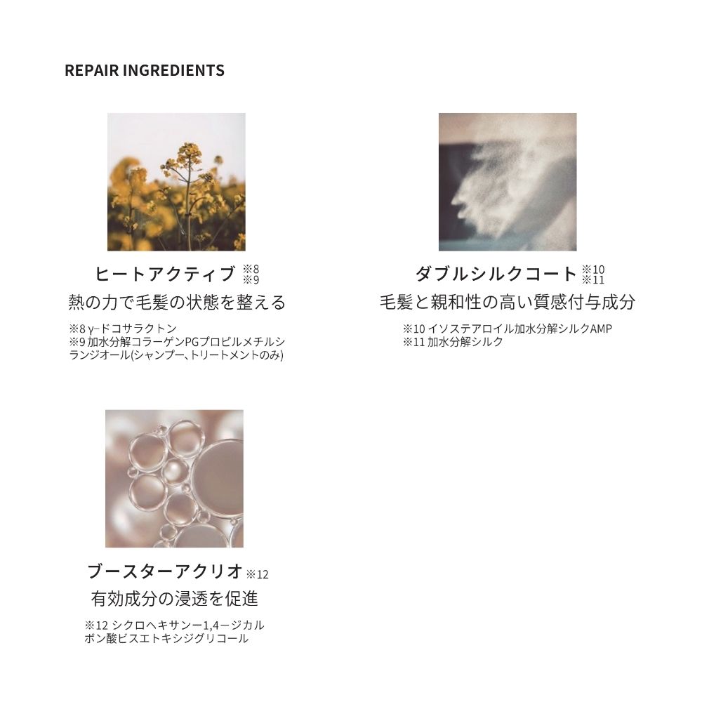 毛髪のねじれやうねりを補正することで滑らかな質感に導き、熱反応型成分、毛髪と親和性が高いシルクなどの優れた補修・保護成分をブースター成分の浸透効果で毛髪深部から美しく健やかなへ状態へと導きます。