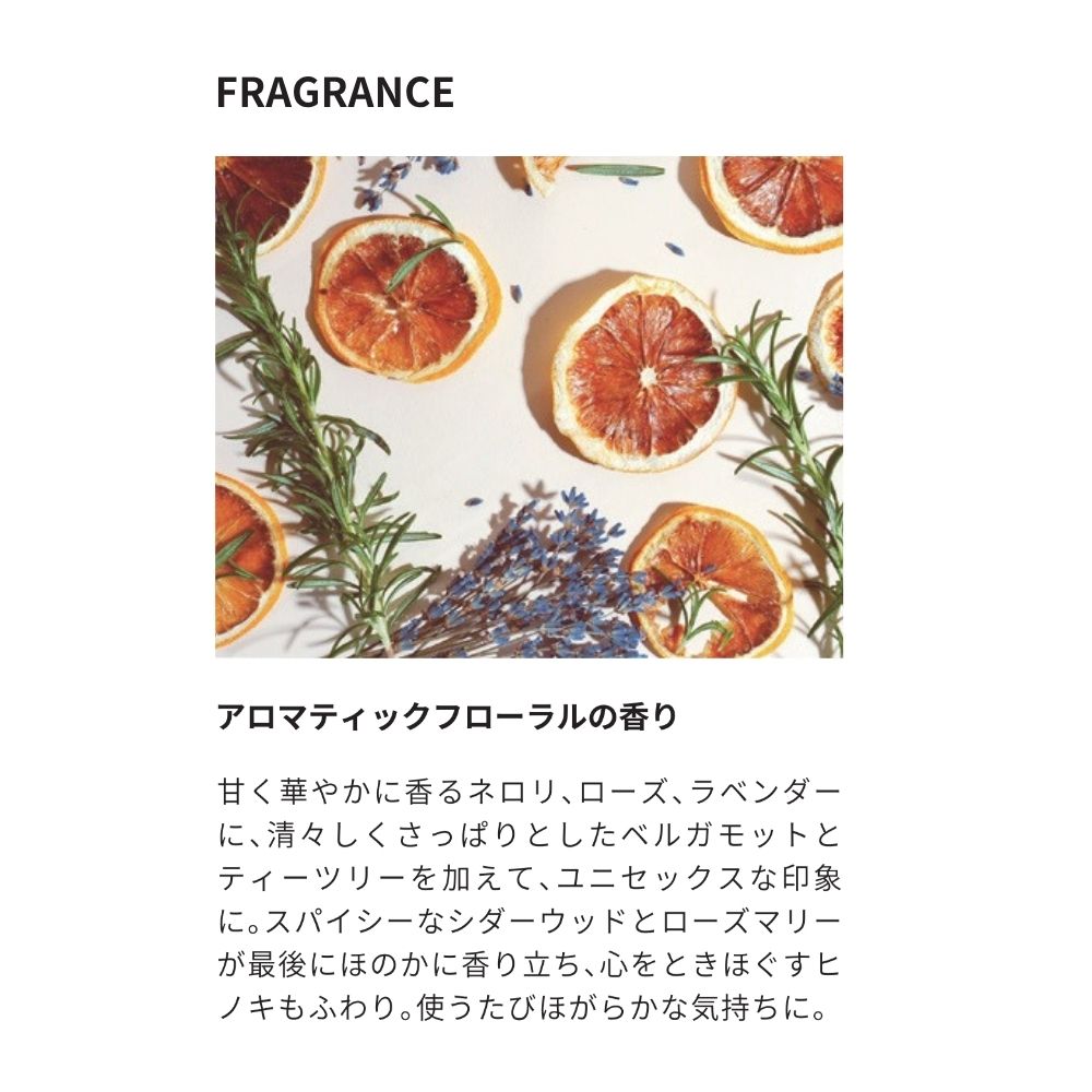 | 香り | アロマティックフローラルの香り 甘く華やかに香るネロリ、ローズ、ラベンダーに、清々しくさっぱりとしたベルガモットとティーツリーを加えて、ユニセックスな印象に。 スパイシーなシダーウッドとローズマリーが最後にほのかに香り立ち、心をときほぐすヒノキもふわり。 使うたびほがらかな気持ちに。 TOP・・・アップル、ベルガモット、ティーツリー MIDDLE・・・ネロリ、ローズ、ラベンダー LAST・・・ムスク、シダーウッド、ローズマリー |
