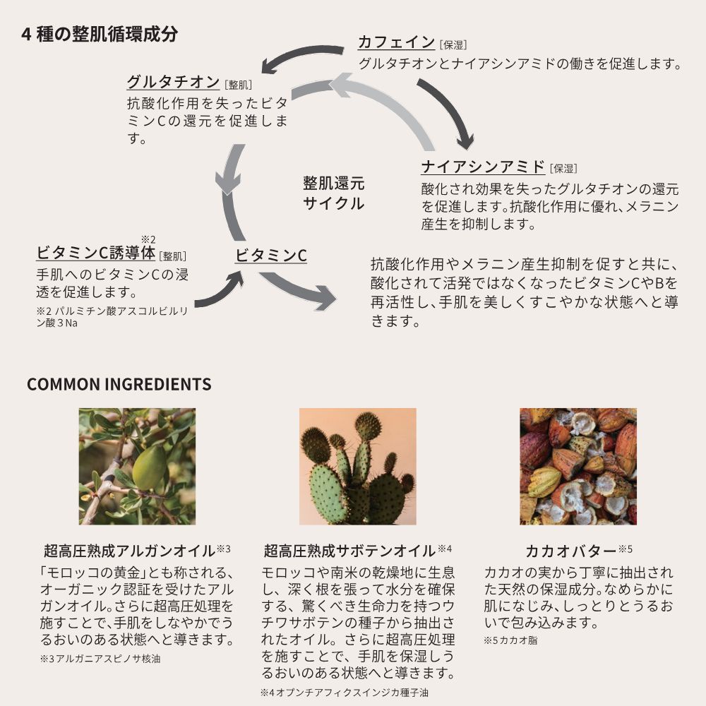 抗酸化作用やメラニン産生抑制を促すと共に、酸化されて活発ではなくなったビタミンCやBを再活性し、手肌を美しくすこやかな状態へと導きます。
