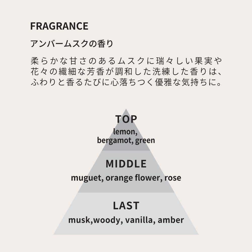 | 香り | アンバームスクの香り 柔らかな甘さのあるムスクに瑞々しい果実や花々の繊細な芳香が調和した洗練した香りは、ふわりと香るたびに心落ちつく優雅な気持ちに。 TOP・・・レモン, ベルガモット, グリーン,br> MIDDLE・・・ミュゲ, オレンジフラワー, ローズ LAST・・・ムスク、ウッディ, バニラ, アンバー |