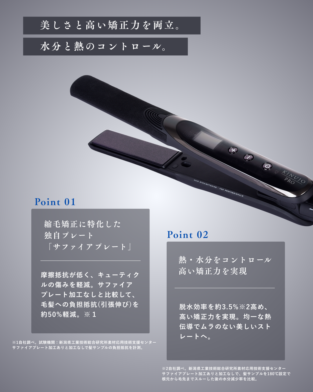 *2 自社調べ。新潟県工業技術総合研究所素材応用技術支援センター サファイアプレート加工ありと加工なしで、髪サンプルを180℃設定で根元から毛先までスルーした後の水分減少率を比較。