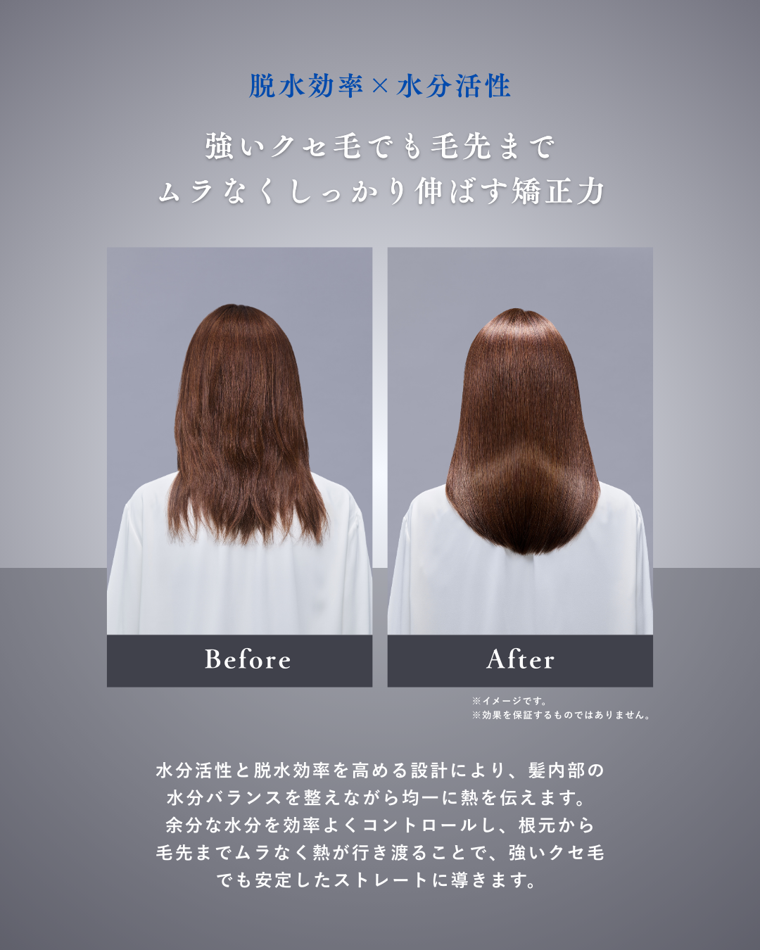 水分活性と脱水効率を高める設計により、髪内部の水分バランスを整えながら均一に熱を伝えます。