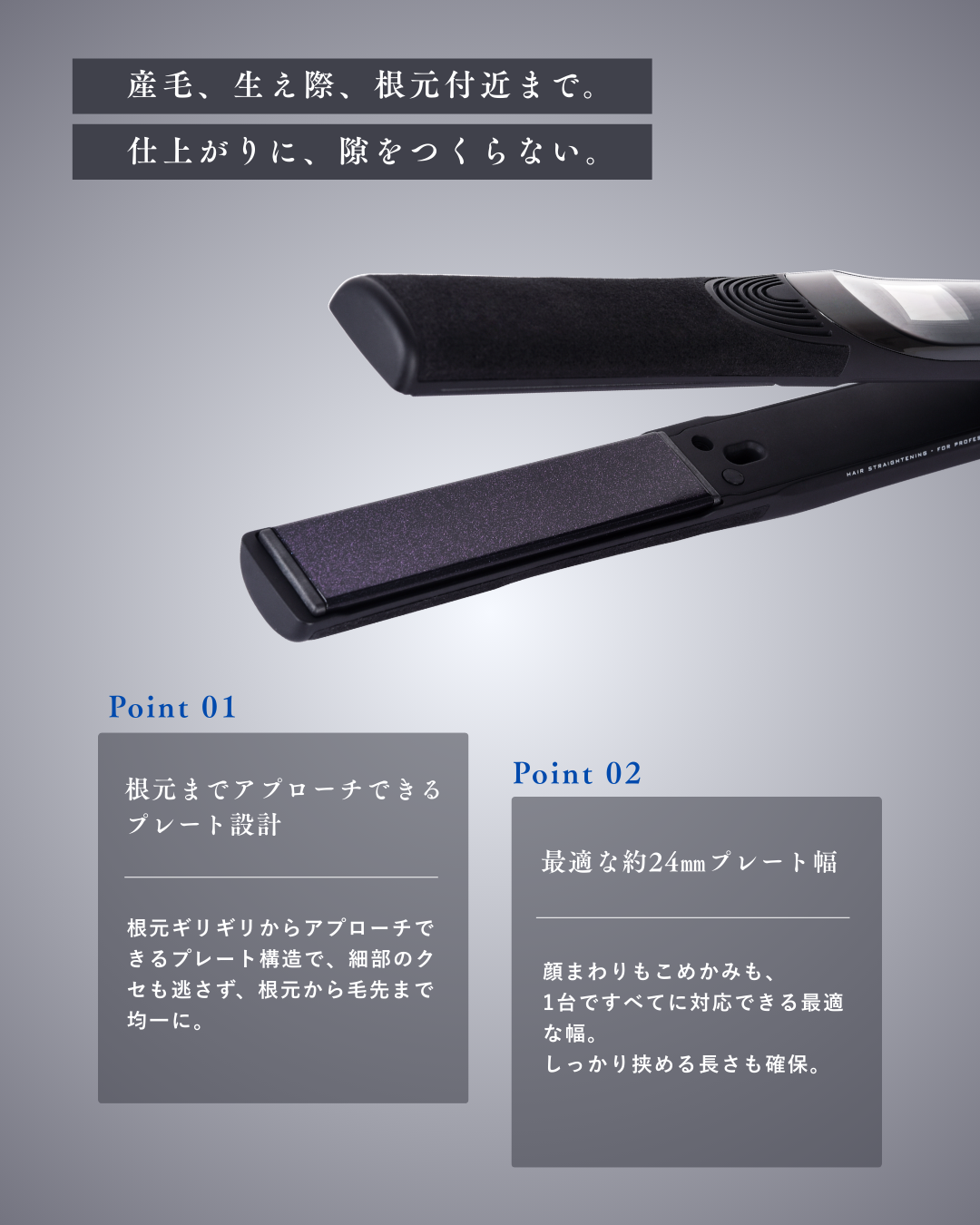 根元ギリギリからアプローチできるプレート構造で、細部のクセも逃さず、根元から毛先まで均一に。