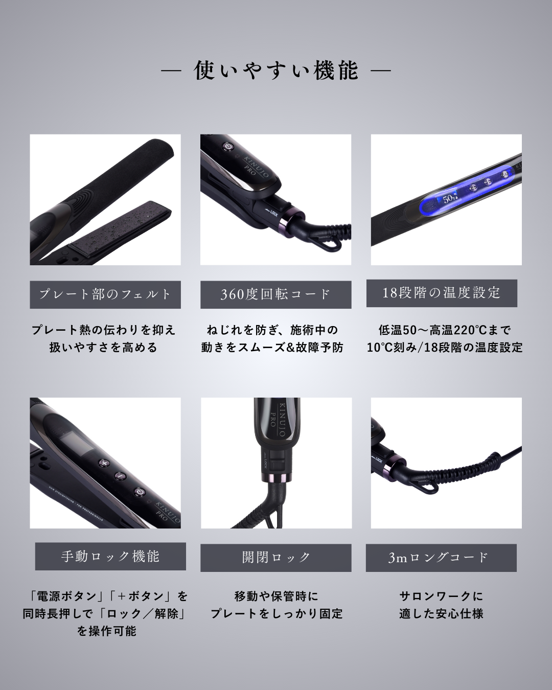 左右に動くクッション機能で根元から毛先まで、安定したストレートに導きます。